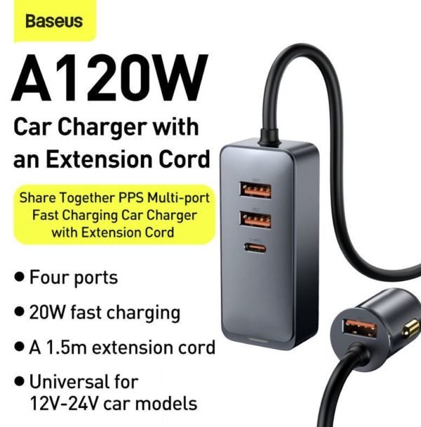 Details and Specifications of Original Baseus Share Together PPS Multi-port Fast Charging Car Charger With Extension Cord 120W 3U+1C