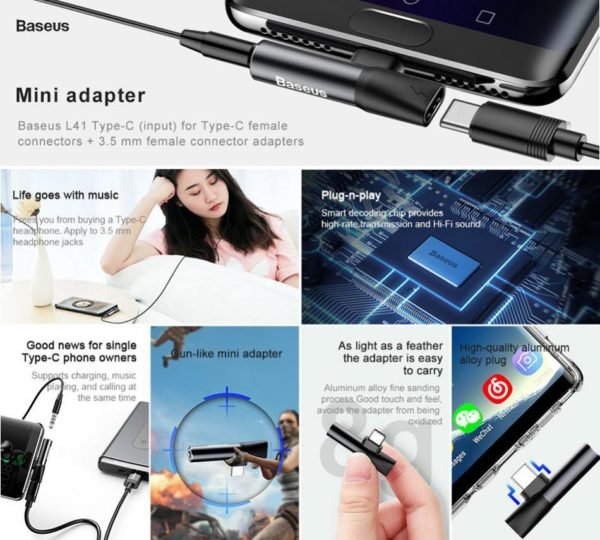 - Baseus L41 USB Type C Male to Type-C Female+ 3.5mm Headphone Jack Adapter Converter for Xiaomi 6 8 Huawei Mate10 P20 Nubia Z17S
