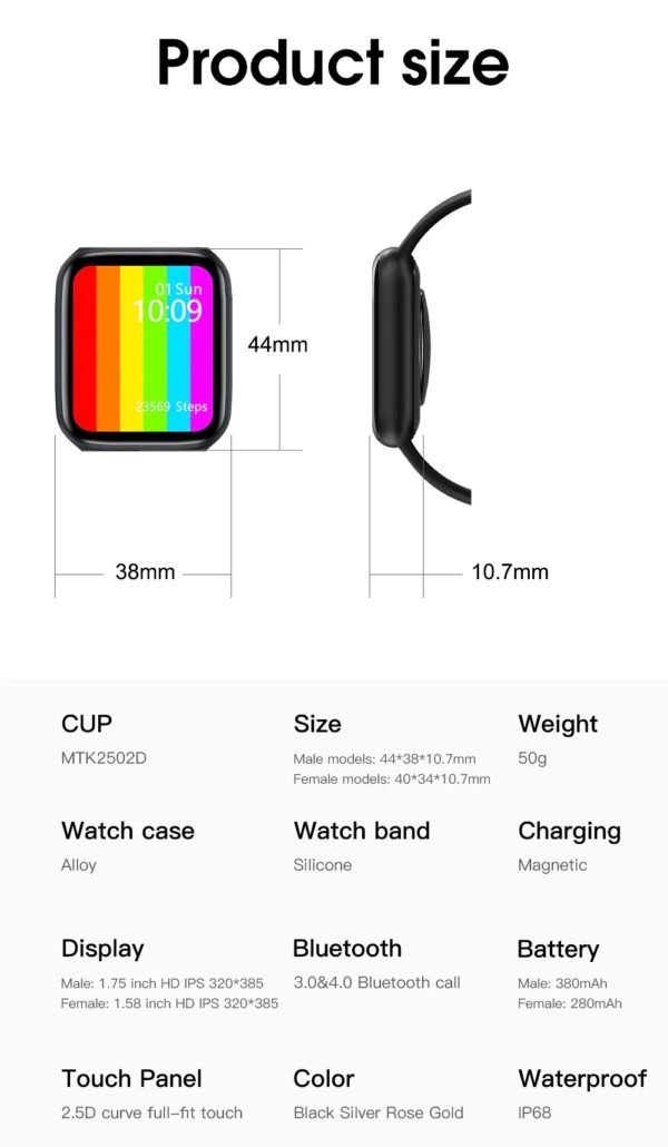 - Steps, Fruit wath 5 Size, 44mm/40mm changeable band, Smart Beehive style menu, The nine box menu, IP68 waterproof