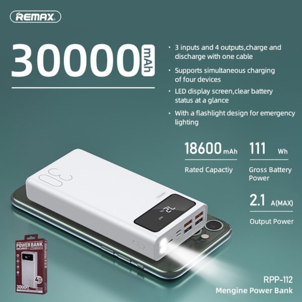 Details and Specifications of Original REMAX RPP-112 HIGH CAPACITY POWER BANK 4USB OUTPUTS & 3USB INPUTS 30000MAH