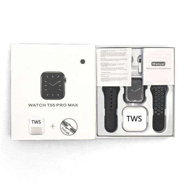 T55 Pro Max smart watch lets you receive or reject calls and comes with other fitness functions including heart rate, blood pressure, and calorie loss. You can run this smart-watch for 2-3 days on a full charge. It has a built speaker and can control pause/play / next/previous audio music with this watch. It has sports, health information, track, pedometer, sports steps, calorie consumption, exercise mileage record, sleep detection, heart rate, Bluetooth call, and alarm clock functions. This smartwatch comes with a pair of Earbuds. Original T55 Plus Pro Max Bluetooth Calling Smartwatch with Free 2 Pair belts and Wireless Bluetooth Earphone Original T55 Plus Pro Max Bluetooth Calling Smartwatch with Free 2 Pair belts and Wireless Bluetooth Earphone Original T55 Plus Pro Max Bluetooth Calling Smartwatch with Free 2 Pair belts and Wireless Bluetooth Earphone   Features: