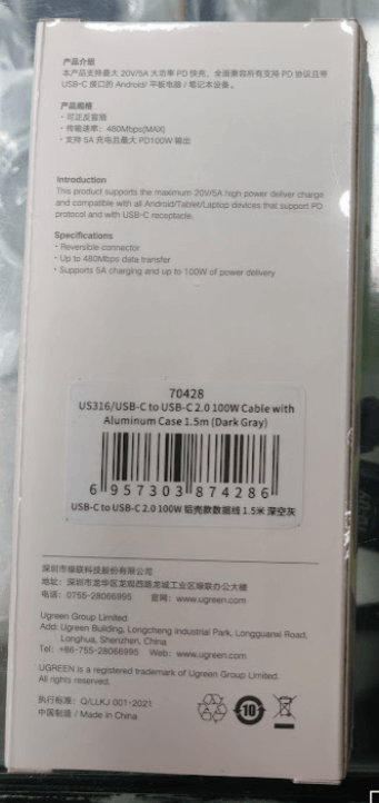 Details and Specifications of Original UGREEN 100W USB C Cable to USB C Cable 1.5m – dark grey US316